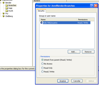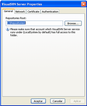 Los repositorios se pueden crear o importar desde el mismo panel de VisualSVN Server. En las propiedades de cada elemento hay una pestaña para cambiar los permisos de seguridad. Si quieres más control, un botón da acceso al intérprete de comandos SVN.