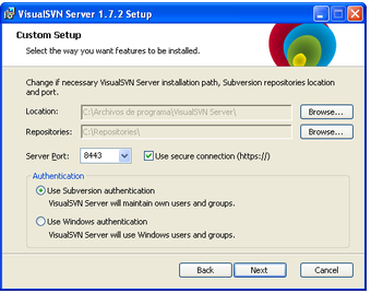 VisualSVN Server es paquete de instalación que incluye Subversion y el servidor web Apache ya configurados y listos para funcionar desde el primer momento. La instalación es muy rápida, sin complicaciones.