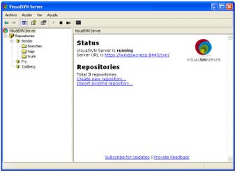 VisualSVN Server se carga como un servicio más. Su panel de control utiliza el aspecto familiar de las consolas de Windows, con un resumen de los repositorios activos y la dirección del servidor.